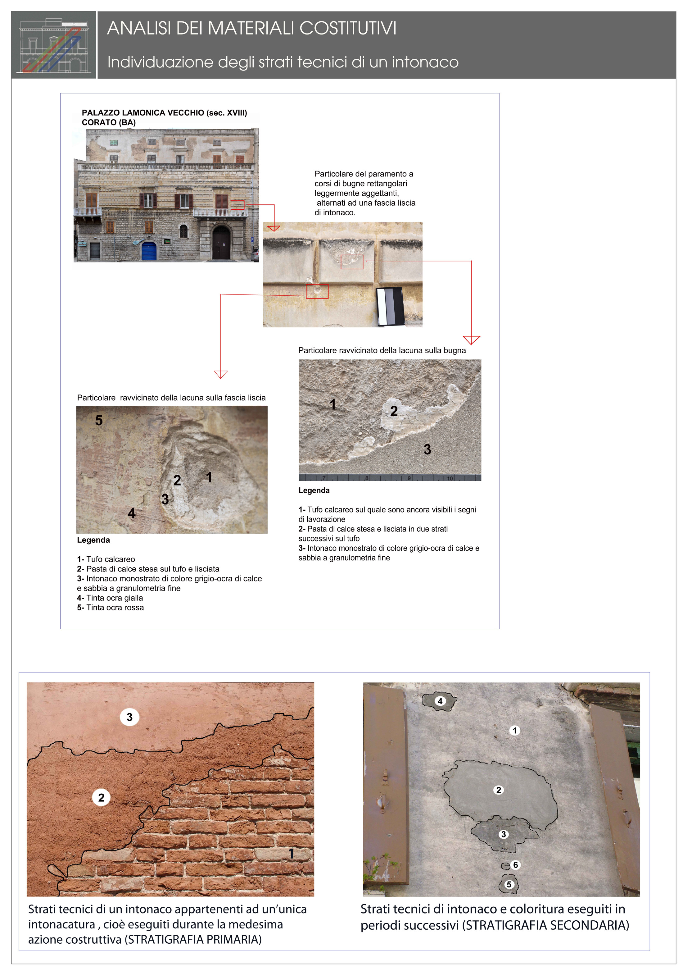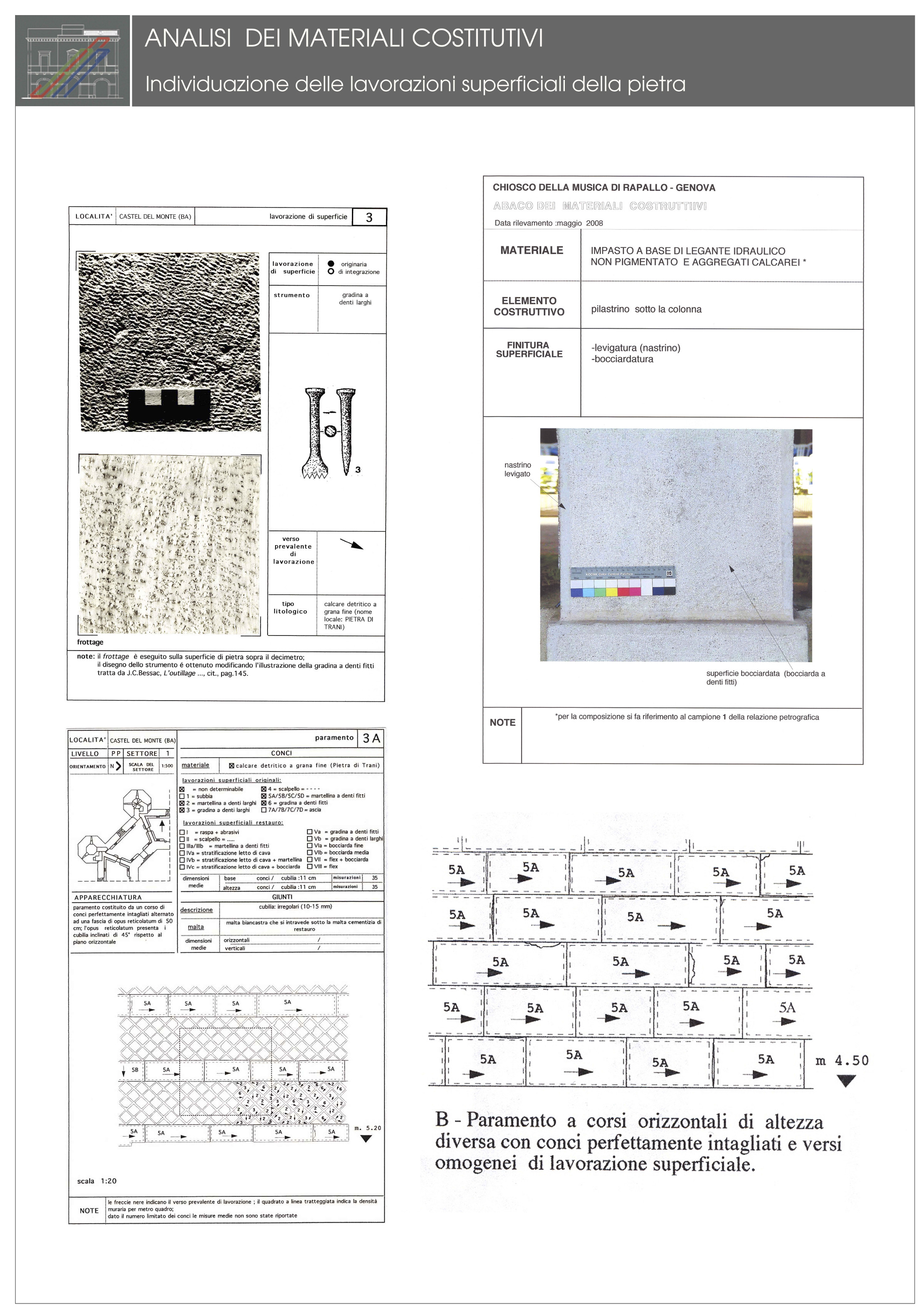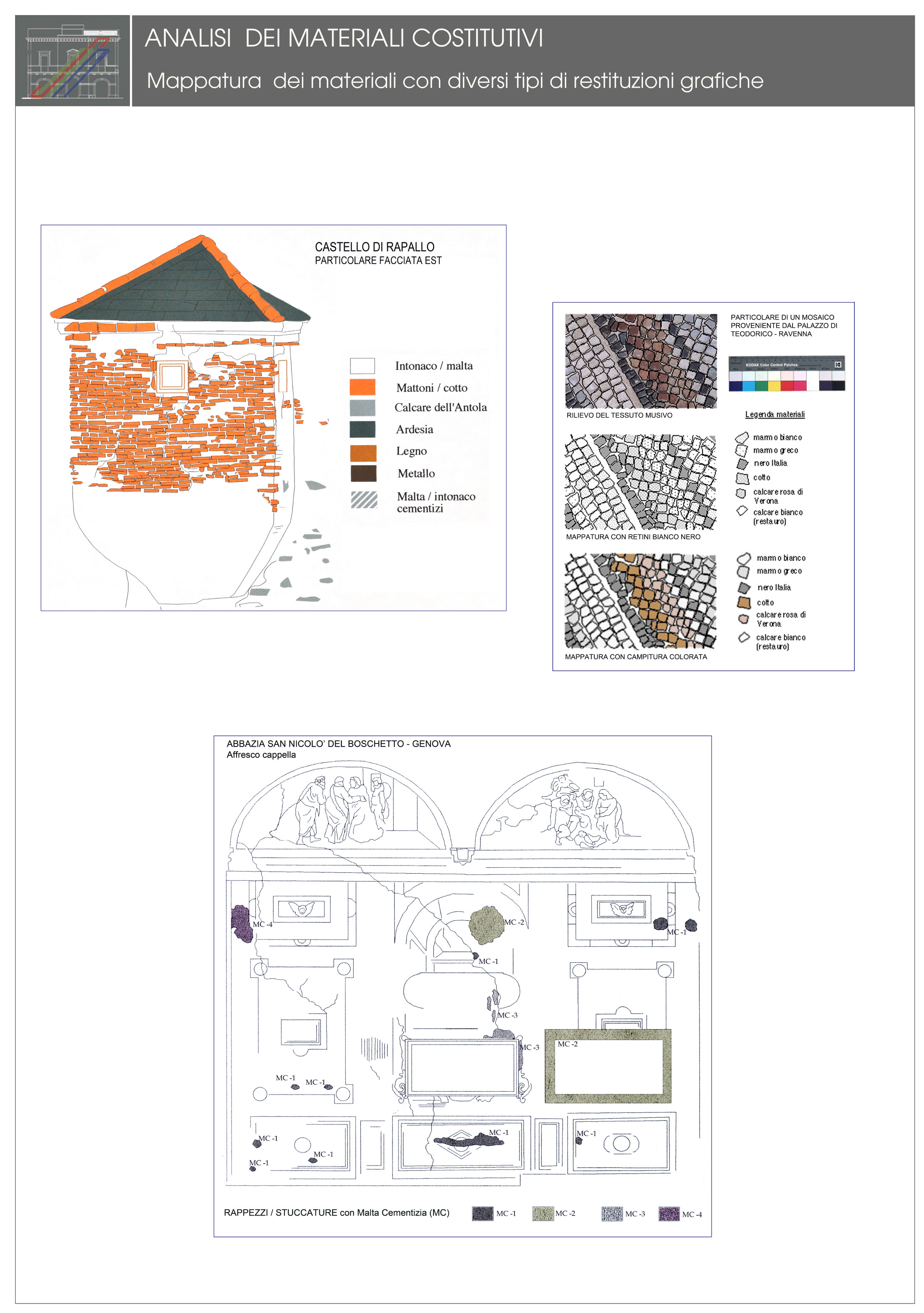 Individuazione dei materiali costitutivi della fabbrica e registrazione delle informazioni rilevate mediante la redazione di una mappa tematica che utilizza come supporto gli elaborati al tratto o i fotopiani.
